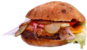 (телешко, марула „Айсберг“, кисели краставици, чедар, дресинг, майонеза и порция пържени картофи)