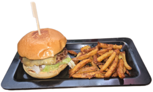 (телешко, сирене бри, халапеньо, майонеза, чедър, бекон, марула, карамелизиран лук и порция пържени картофи)