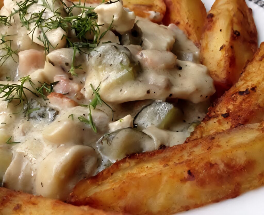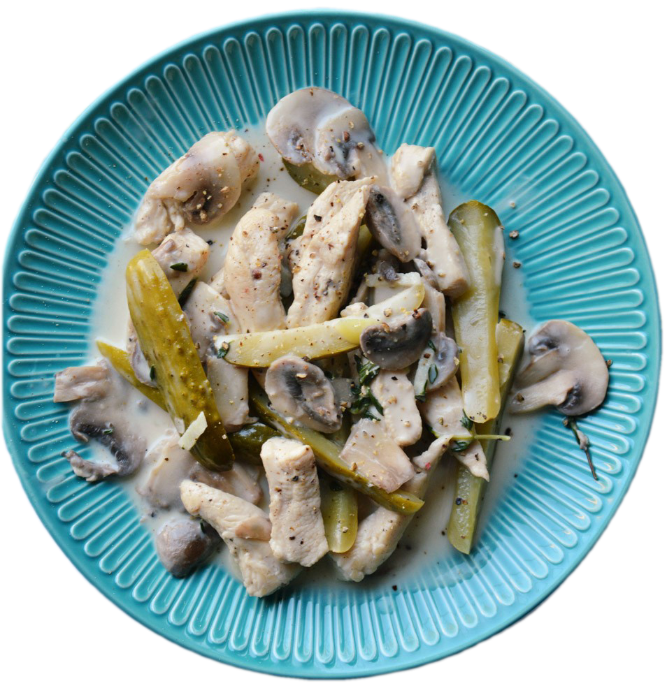 ПИЛЕ ЖУЛИЕН 300гр. пилешко филе, сметана, кисели краставички, бекон, гъби и кашкавал – 13,99лв./7,10€
