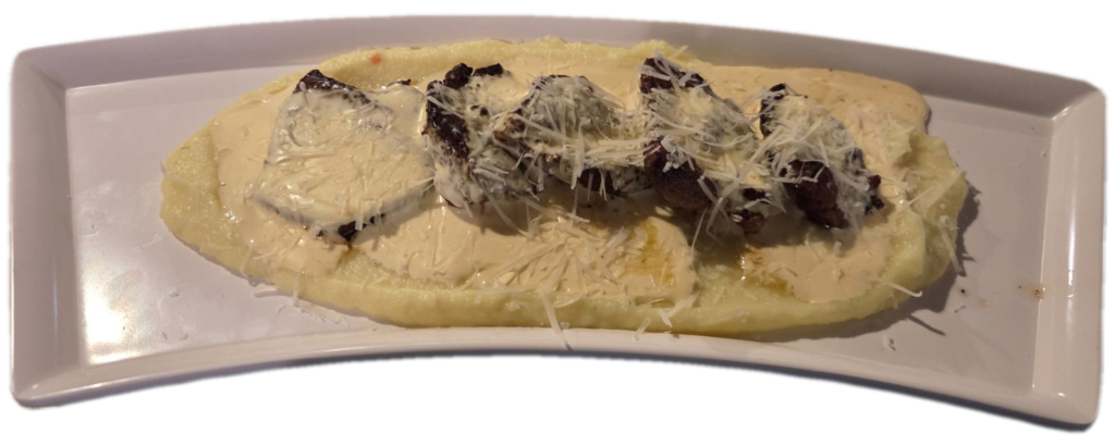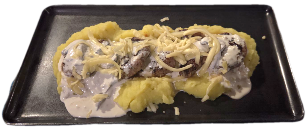 ТЕЛЕШКО КЪЛЦАНО 350гр. с бекон, чедър и гъбен сос върху картофено пюре – 13,99лв.7,15€