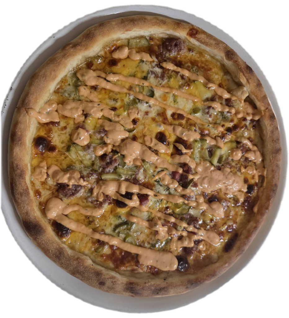 ПИЦА ЧИЙЗ БУРГЕР 500гр. телешка кайма, кисели краставички, кашкавал и сосове барбекю и чедър – 13,99лв.7,15€