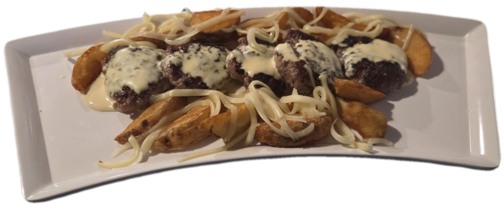 КЮФТЕНЦА БАРБЕКЮ 300гр. с разтопен чедър, уеджис картофи и кашкавал – 14,99лв./7,15€