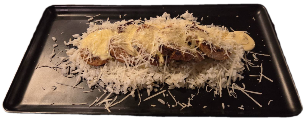 СВИНСКО БОН ФИЛЕ ПАРМЕДЖАНО в-у ориз и гъбен сос – 13,99лв./7,15€